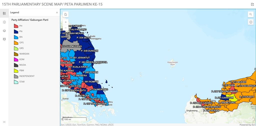 - Choose one of the following maps by clicking on the tabs above – Etnik Pengundi Malaysia [Voter ethnicity], Pengundi Belia Malaysia – [Youth voters], Pengundi Awal Malaysia – [Early Voters]